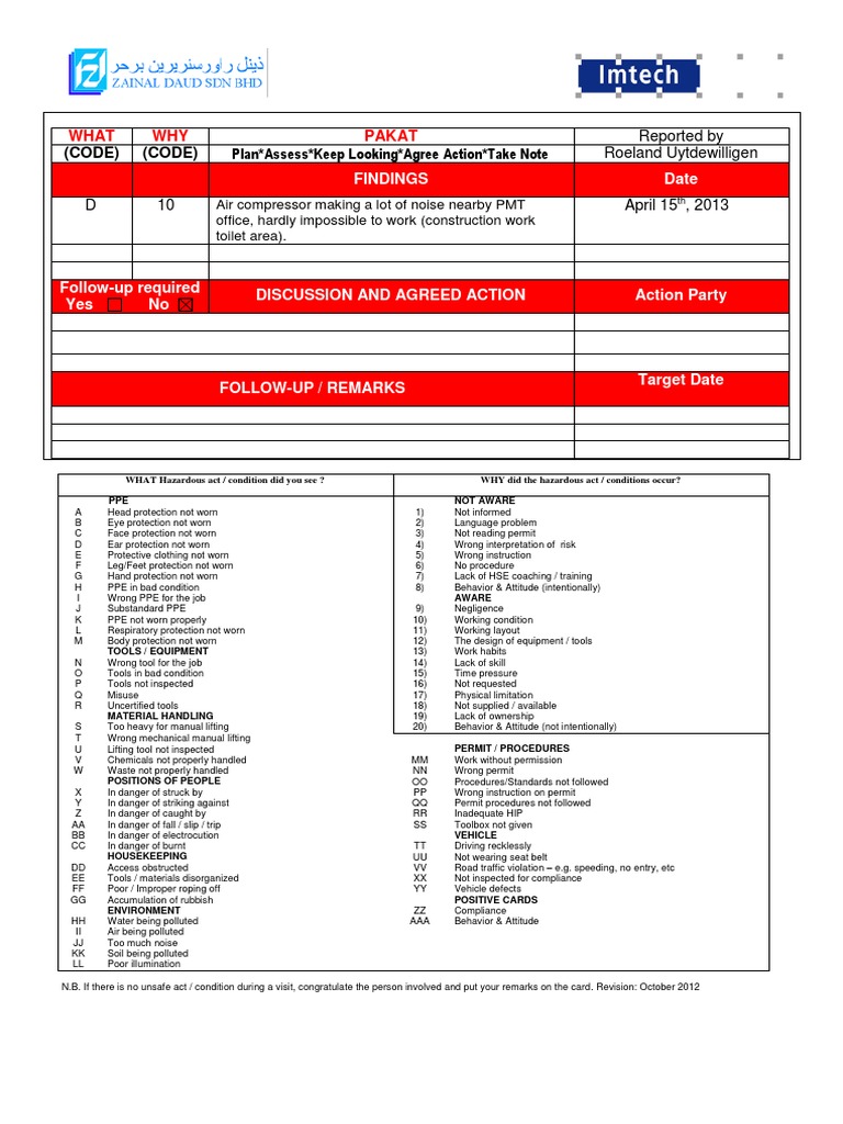 N.B. If there is no unsafe act / condition during a visit, congratulate the person involved and put your remarks on the card. Revision: October 2012