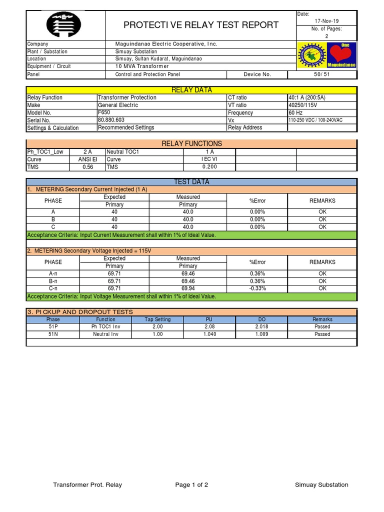 PROTECTIVE RELAY TEST REPORT No. of Pages: