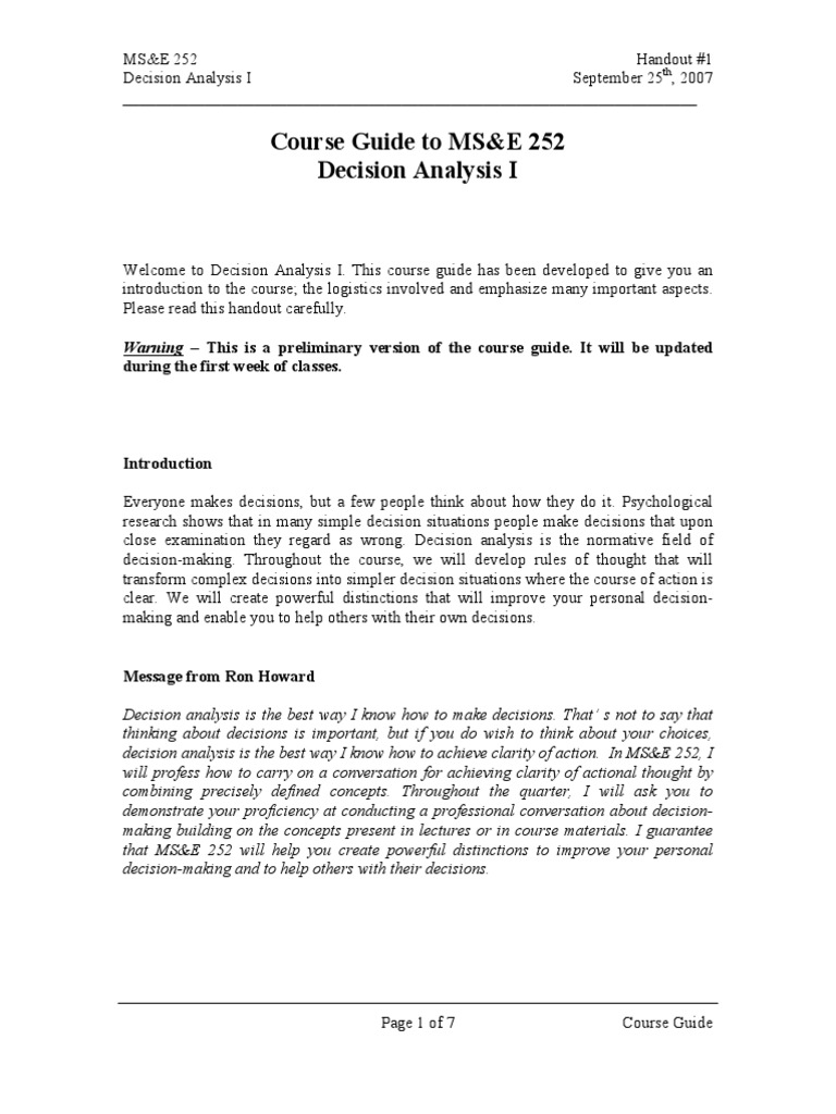 Welcome to Decision Analysis I. This course guide has been developed to give you an