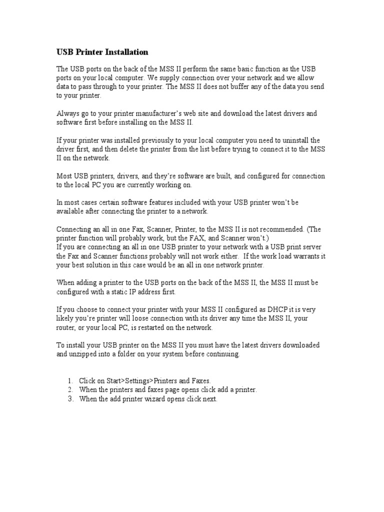To install your USB printer on the MSS II you must have the latest drivers downloaded