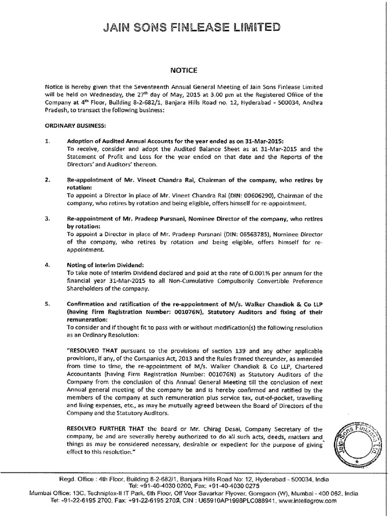 Notice is hereby given that the Seventeenth Annual General Meeting of Jain Sons Finlease Limited