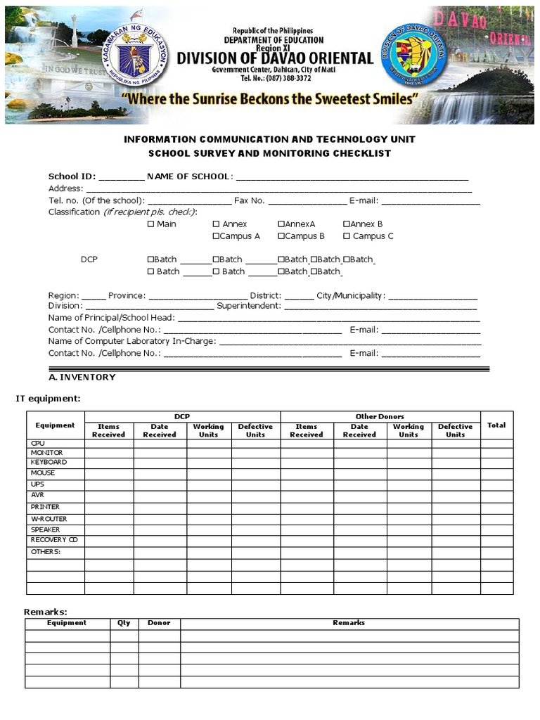 SCHOOL SURVEY AND MONITORING CHECKLIST