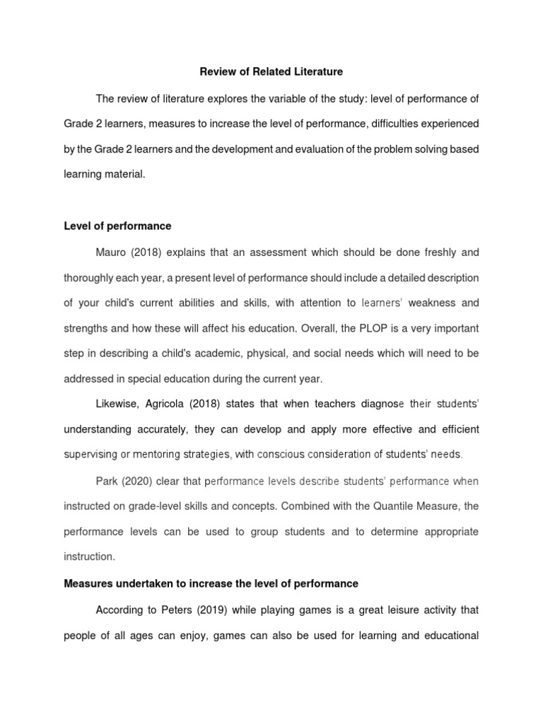 The review of literature explores the variable of the study: level of performance of