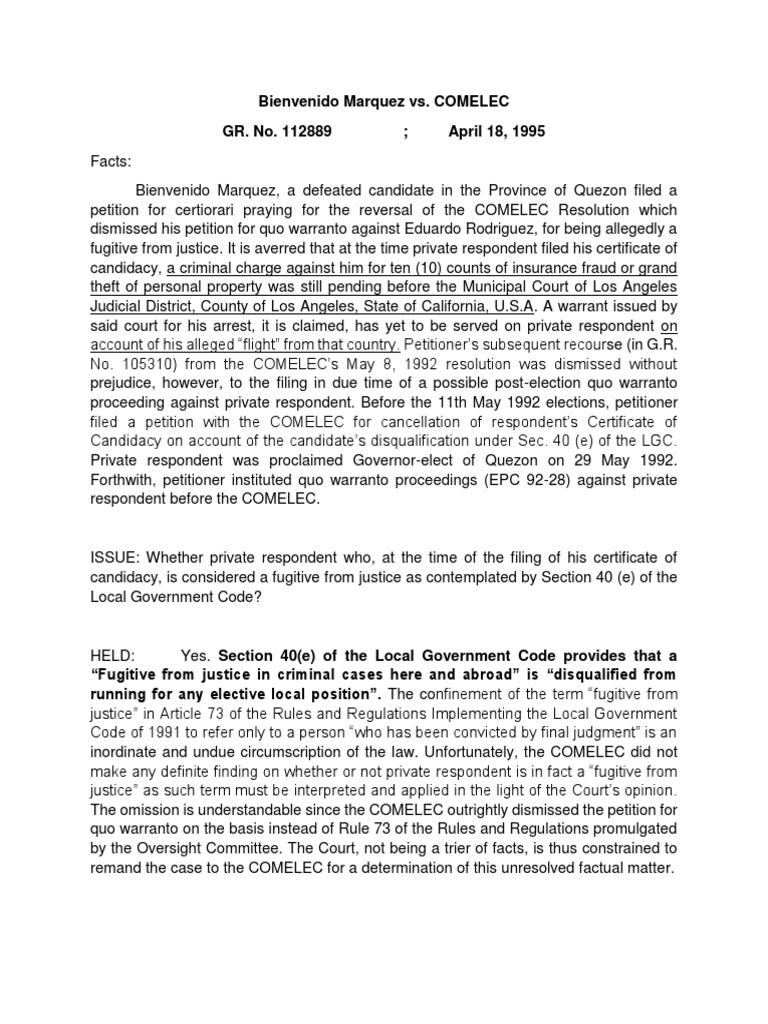 Bienvenido Marquez, a defeated candidate in the Province of Quezon filed a