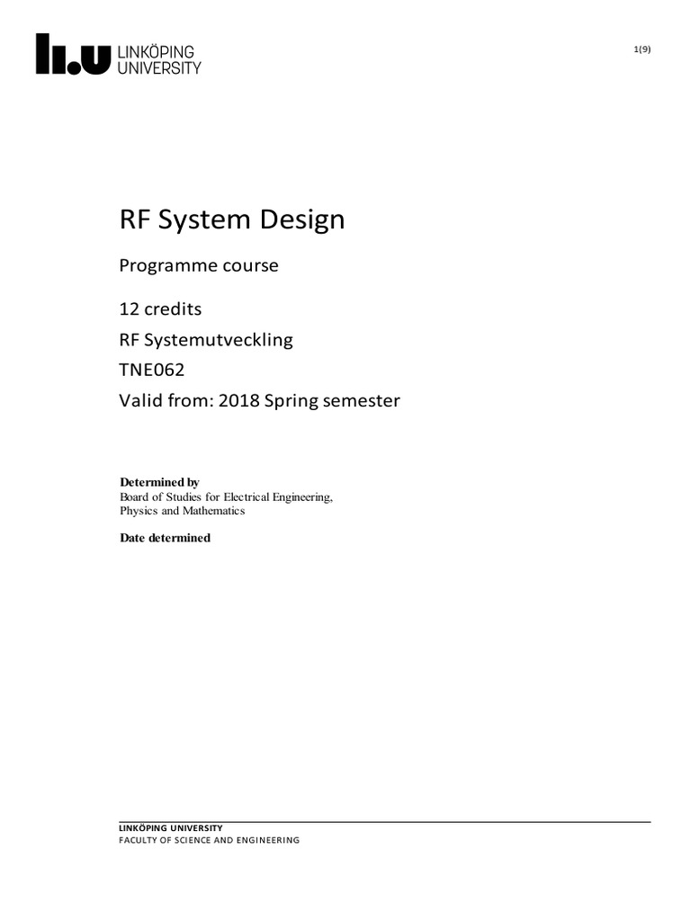 LINKÖPING UNIVERSITY RF SYSTEM DESIGN