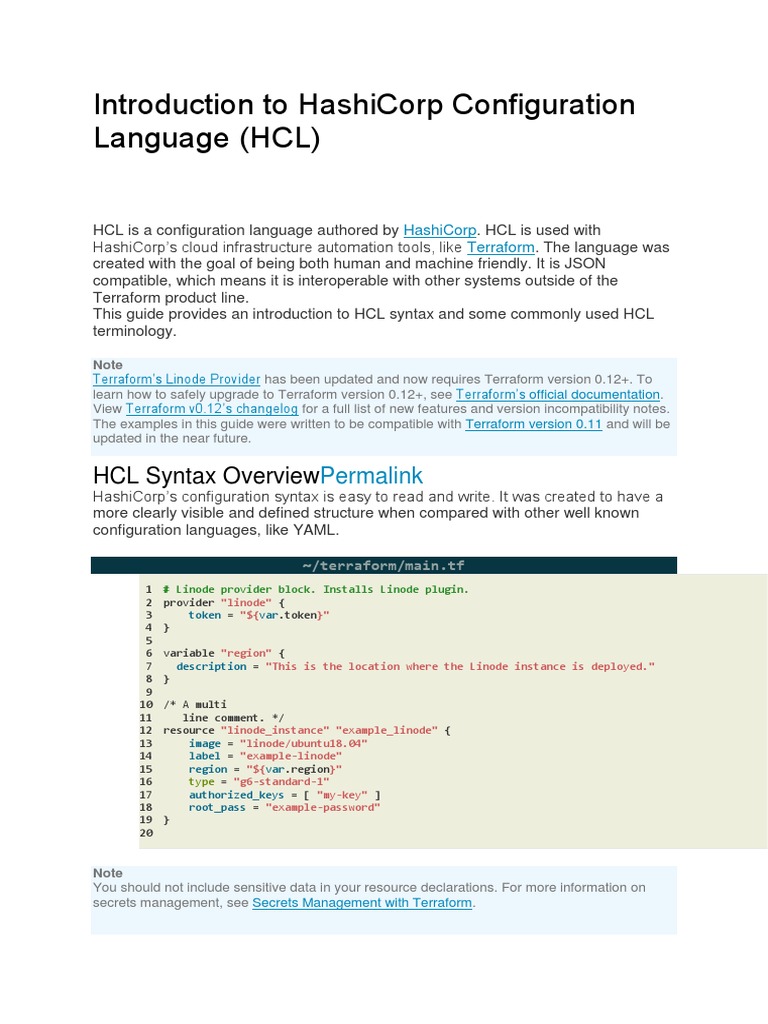 This guide provides an introduction to HCL syntax and some commonly used HCL