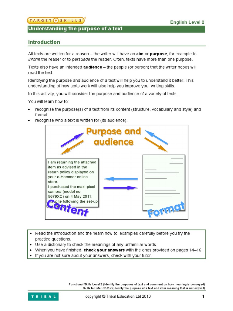 Identifying the purpose and audience of a text will help you to understand it better. This