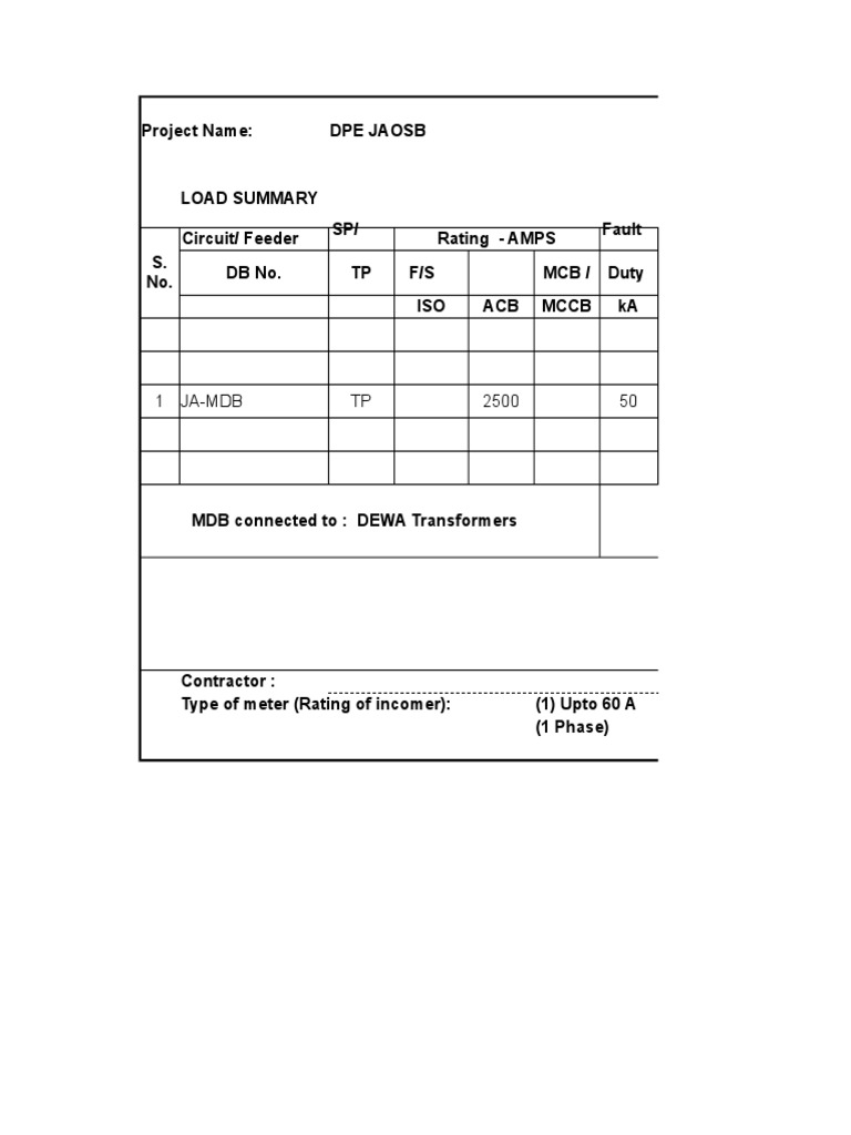 MDB connected to : 1500 KVA Transformer Total connected load per phas