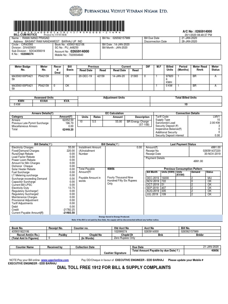 NOTE:Pay your Bill online- www.uppclonline.com Pay DD/Cheque in favour of EXECUTIVE ENGINEER - EDD BARHAJ Please update your Mobile #