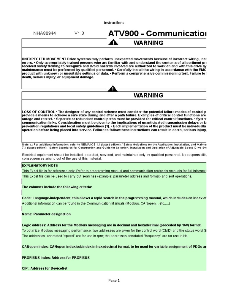This Excel file is for reference only. Refer to programming manual and communication protocols manuals for full information.