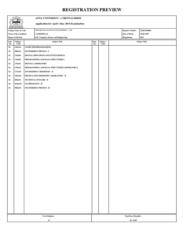 College Name & Code SRI ESHWAR COLLEGE OF ENGINEERING :: 7228 Register Number 722813104014