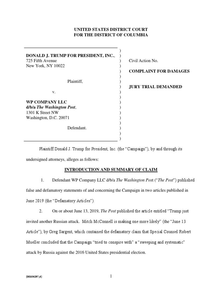 1. Defendant WP Company LLC d/b/a The Washington Post (“The Post”) published