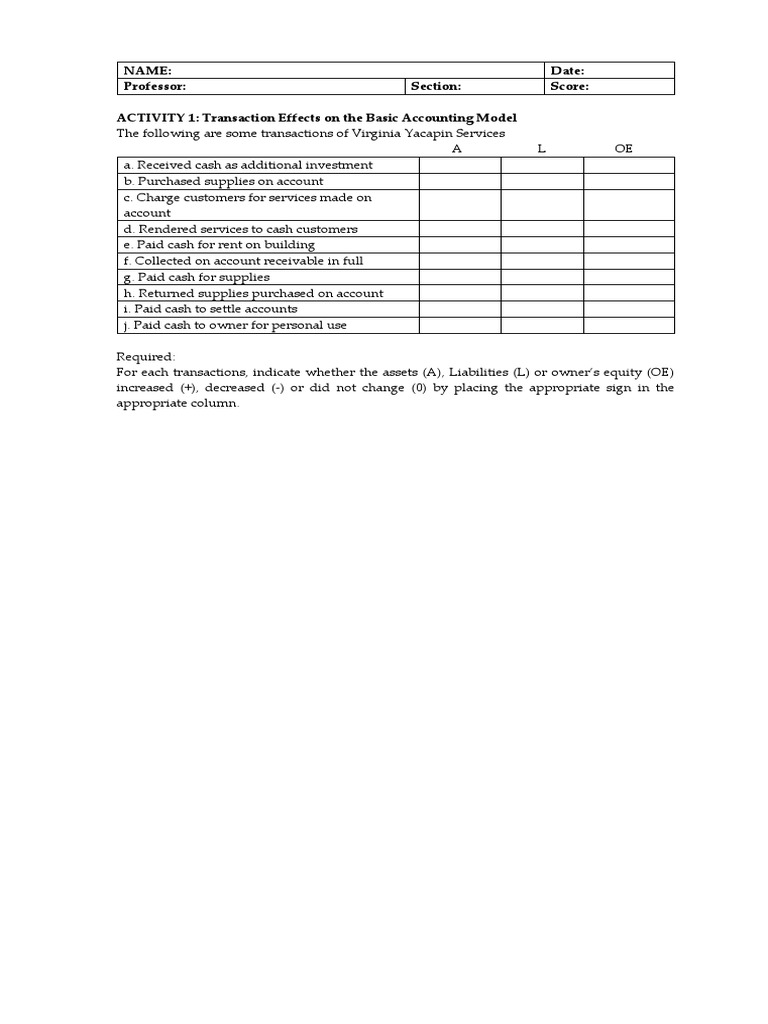 ACTIVITY 1: Transaction Effects on the Basic Accounting Model