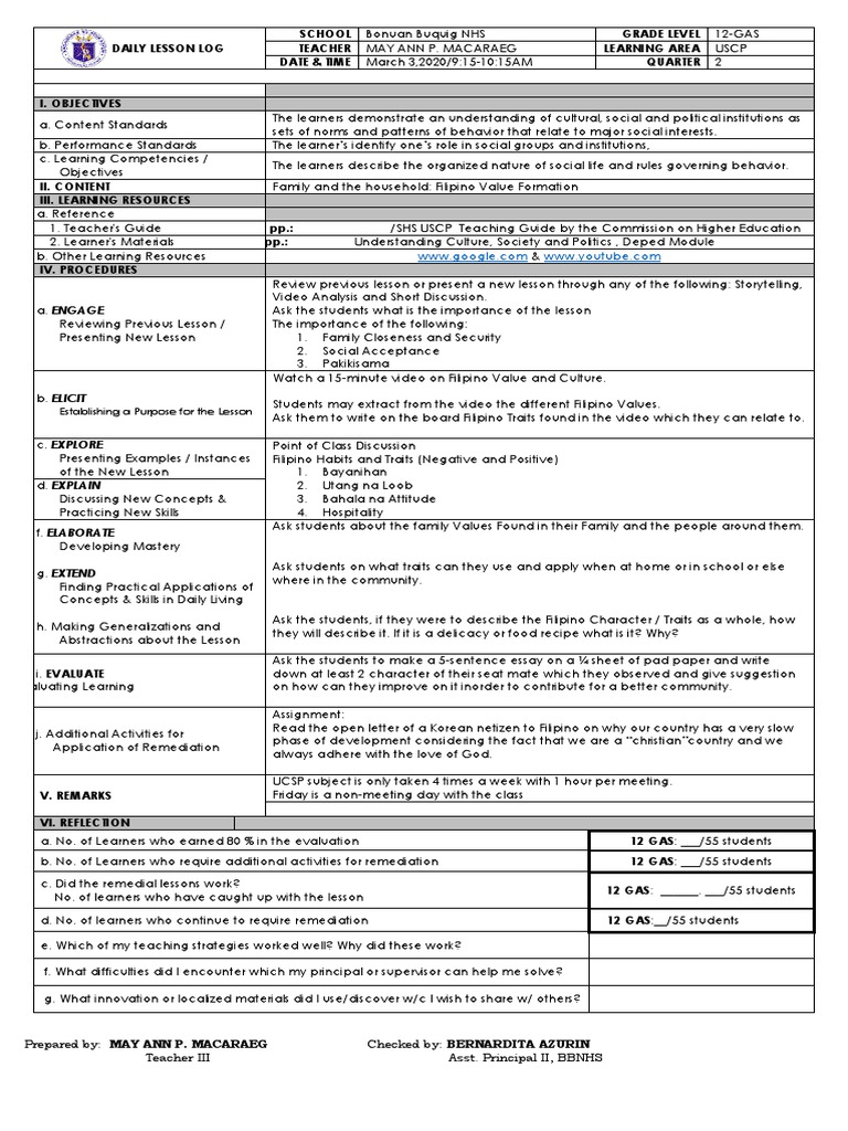 DAILY LESSON LOG TEACHER MAY ANN P. MACARAEG LEARNING AREA USCP