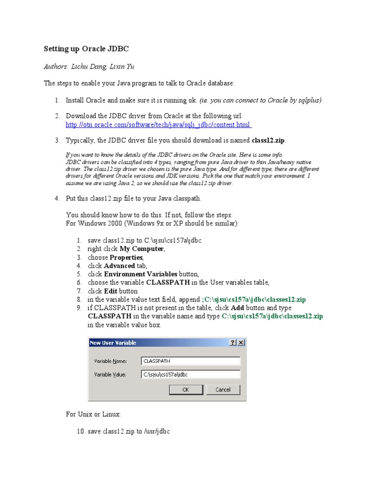 CLASSPATH in the variable name and type C:\sjsu\cs157a\jdbc\classes12.zip