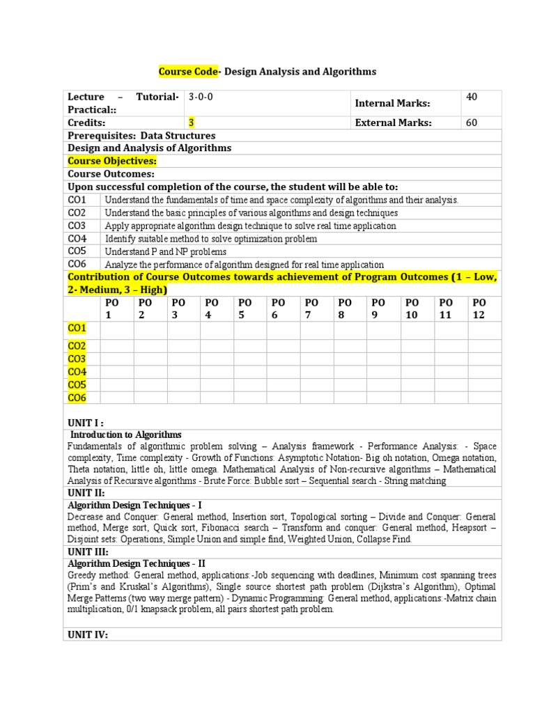 CO1 Understand the fundamentals of time and space complexity of algorithms and their analysis.