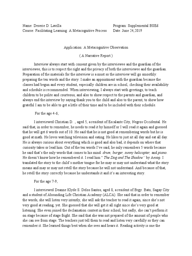 Course: Facilitating Learning: A Metacognitive Process Date: June 24,2019