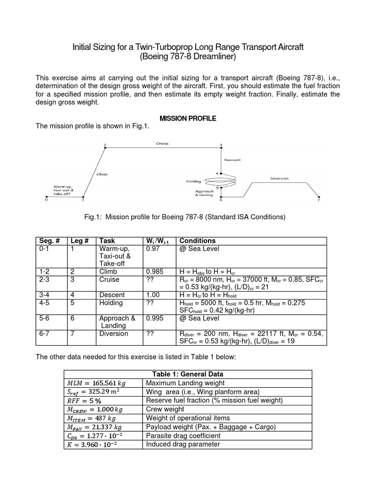 This exercise aims at carrying out the initial sizing for a transport aircraft (Boeing 787-8), i.e.,