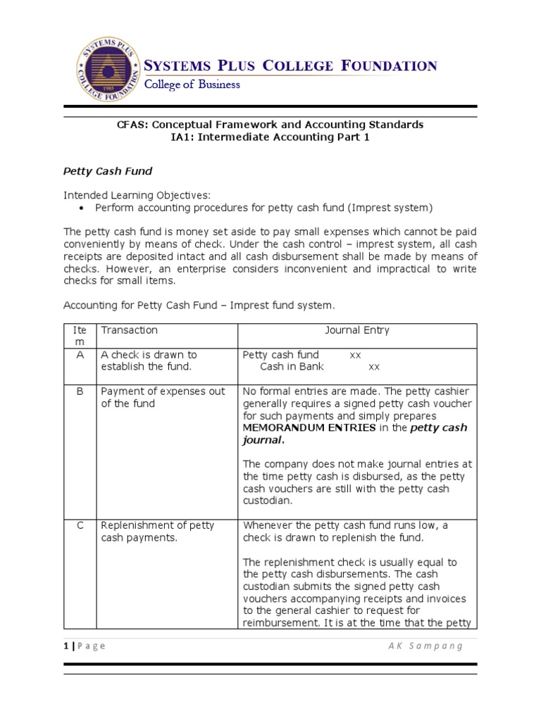 conveniently by means of check. Under the cash control – imprest system, all cash