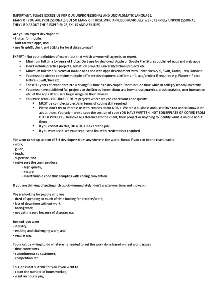 Minimum full time 1+ years of Flutter Dart use for deployed, Apple or Google Play Stores published apps and web apps.