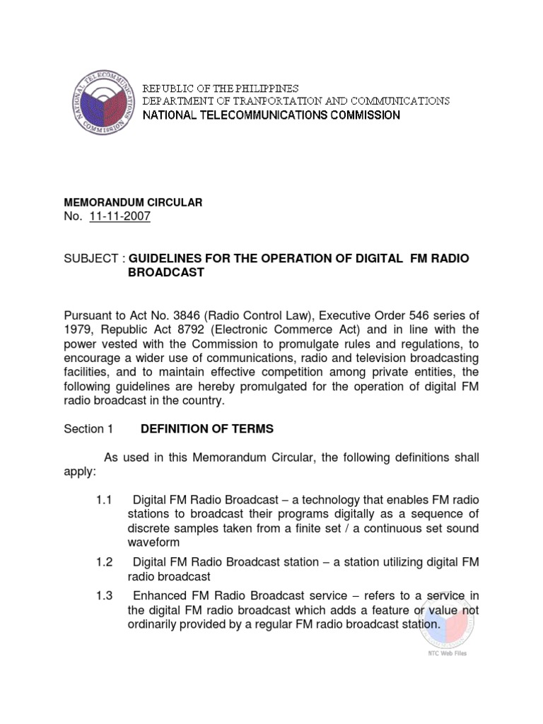 SUBJECT : GUIDELINES FOR THE OPERATION OF DIGITAL FM RADIO