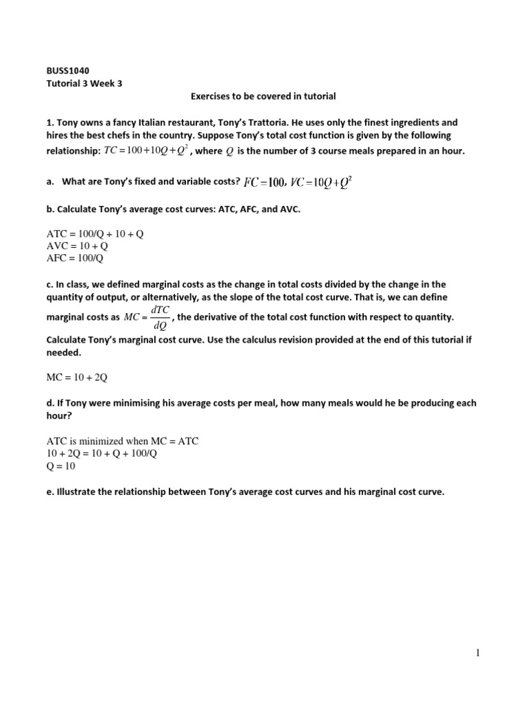 Calculate Tony’s marginal cost curve. Use the calculus revision provided at the end of this tutorial if