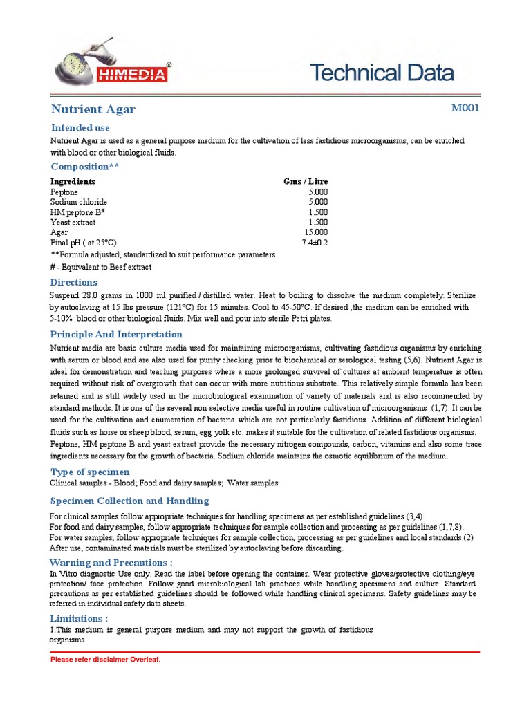 Nutrient Agar is used as a general purpose medium for the cultivation of less fastidious microorganisms, can be enriched