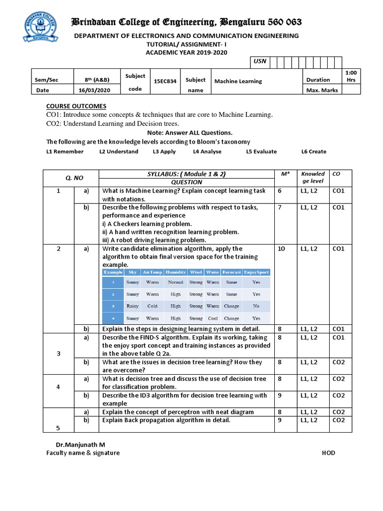 Sem/Sec 8th (A&B) 15EC834 Subject Machine Learning Duration Hrs