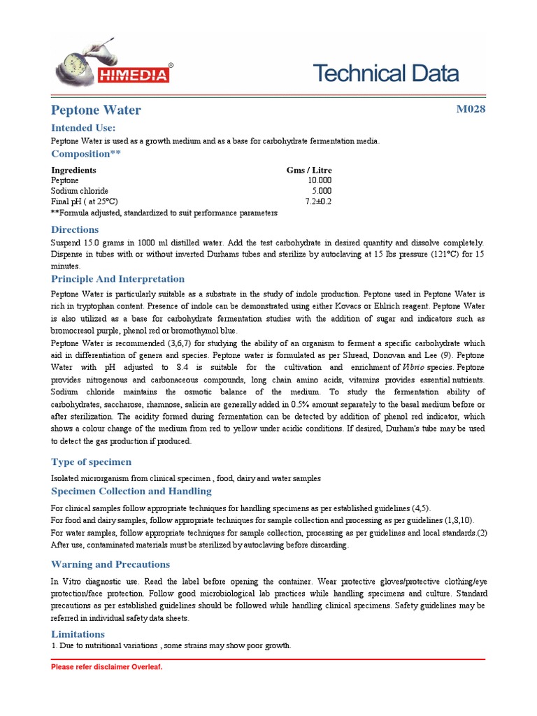 Peptone Water is used as a growth medium and as a base for carbohydrate fermentation media.