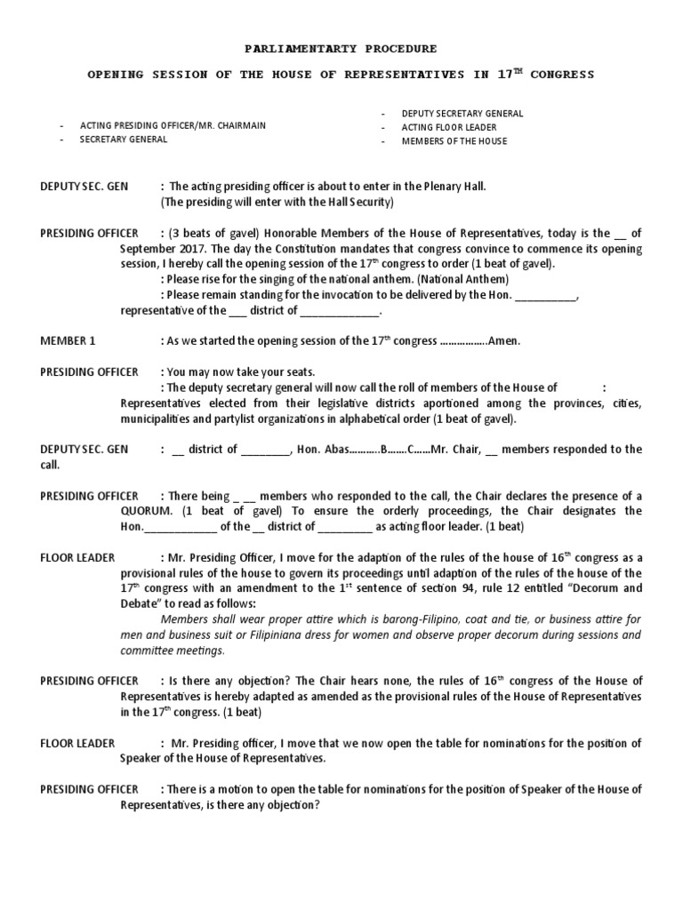 men and business suit or Filipiniana dress for women and observe proper decorum during sessions and