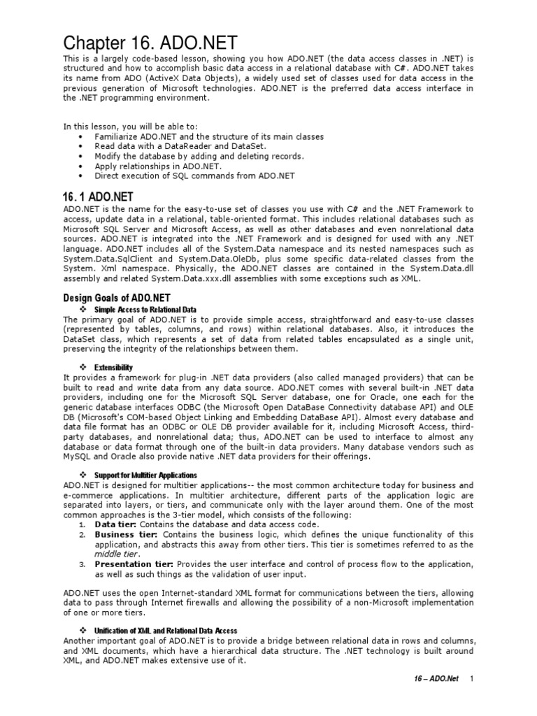 structured and how to accomplish basic data access in a relational database with C#. ADO.NET takes