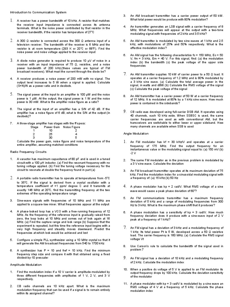 Calculate the power gain, noise figure and noise temperature of the 1. An FM modulator has kf = 30 kHz/V and operates at a carrier