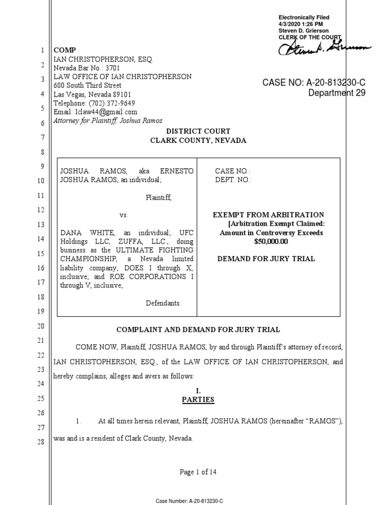 DANA WHITE, an individual; UFC Amount in Controversy Exceeds