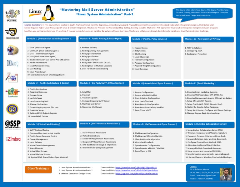 Module -1 ( Introduction to Mailing System ) Module -4 ( Postfix Routing & Relay Mgmt ) Module -7 (Postfix, Policy Services ) Module -10 ( Anti Spam SMTP Proxy )
