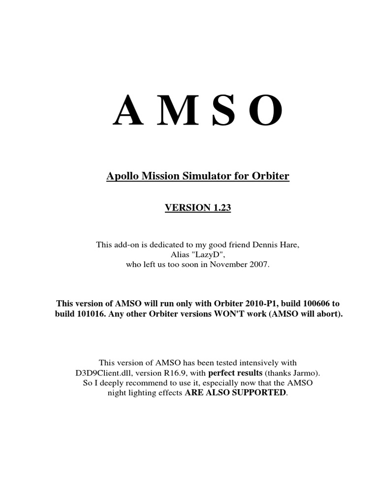 This version of AMSO will run only with Orbiter 2010-P1, build 100606 to