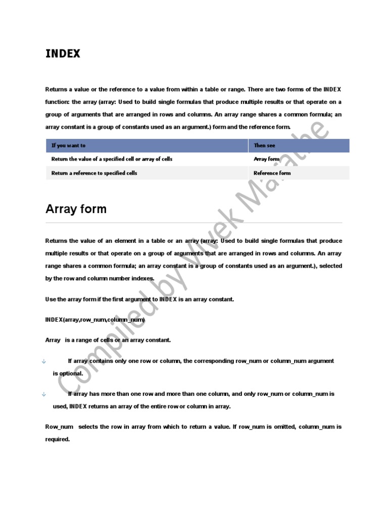 column or row, respectively. To use values returned as an array, enter the INDEX function as an array