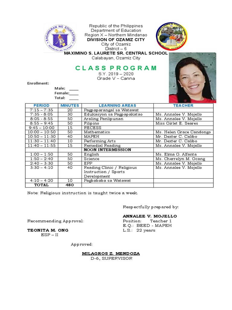 3:30 – 4:10 40 Reading Clinic / Religious Ms. Annalee V. Mojello