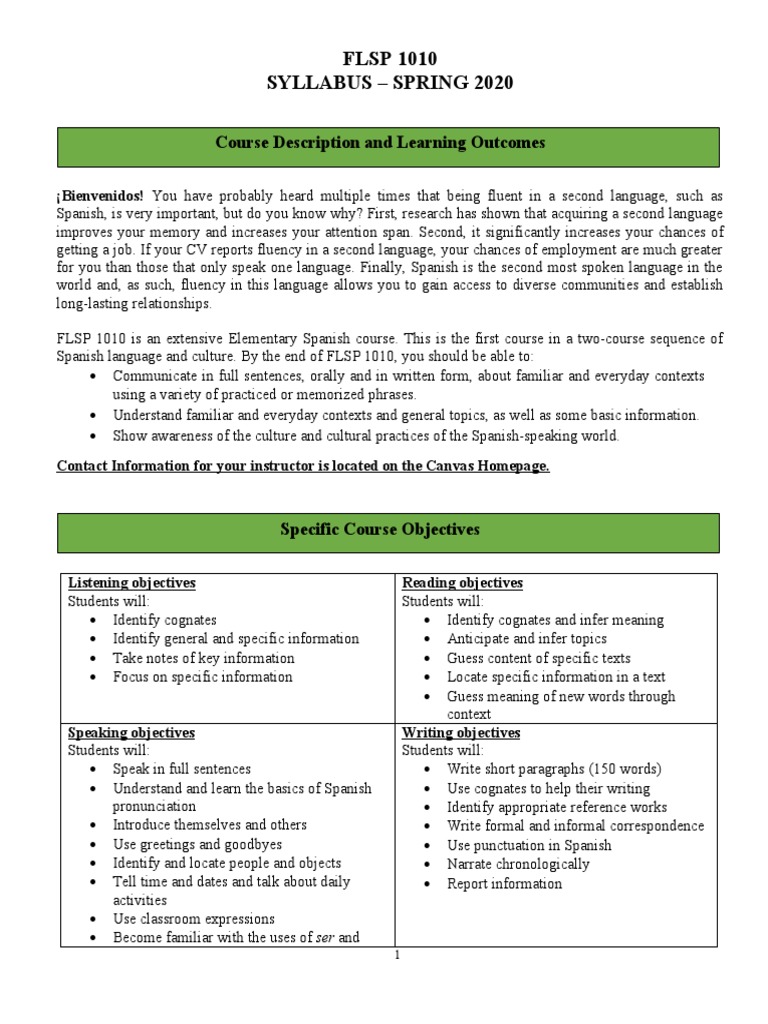 FLSP 1010-Syllabus - Spring 2020 Updated