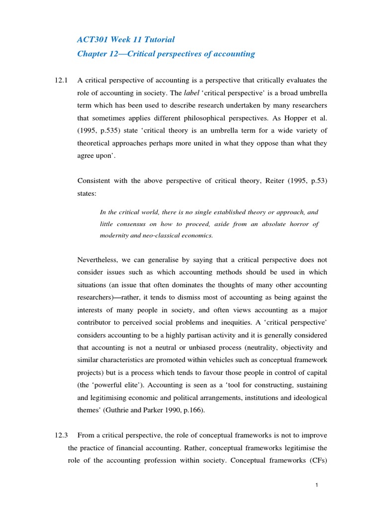 12.1 A critical perspective of accounting is a perspective that critically evaluates the