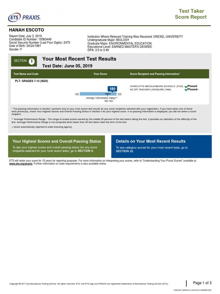 * The passing information in Section I pertains only to your most recent test results for any score recipients selected with your registration. If you have taken one of these