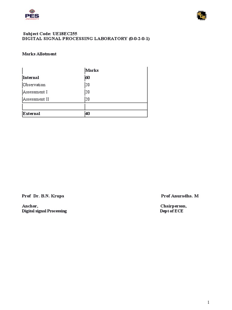 Observation 20 Assessment I 20 Assessment II 20: Digital Signal Processing Dept of ECE
