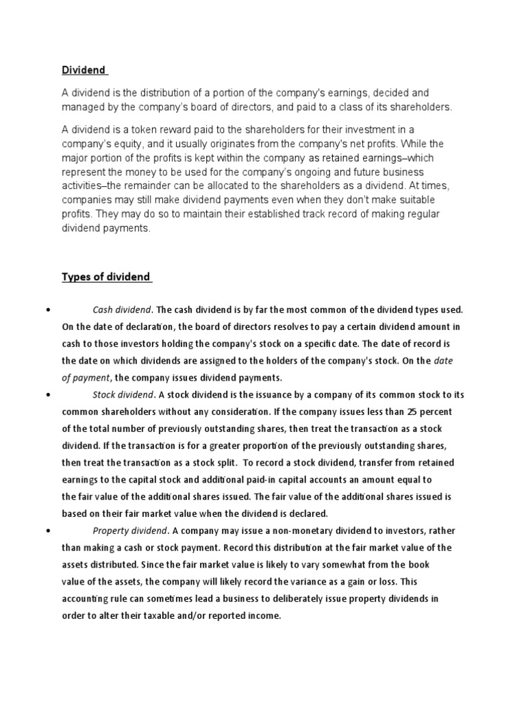 A dividend is the distribution of a portion of the company's earnings, decided and