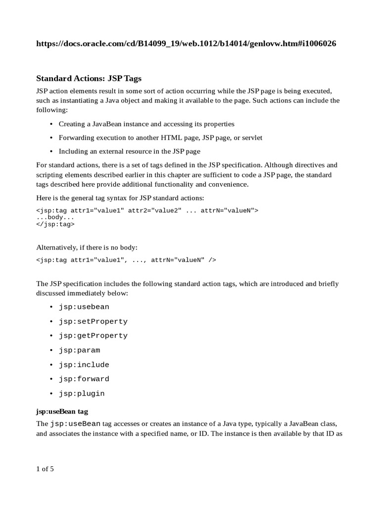 The JSP specification includes the following standard action tags, which are introduced and briefly