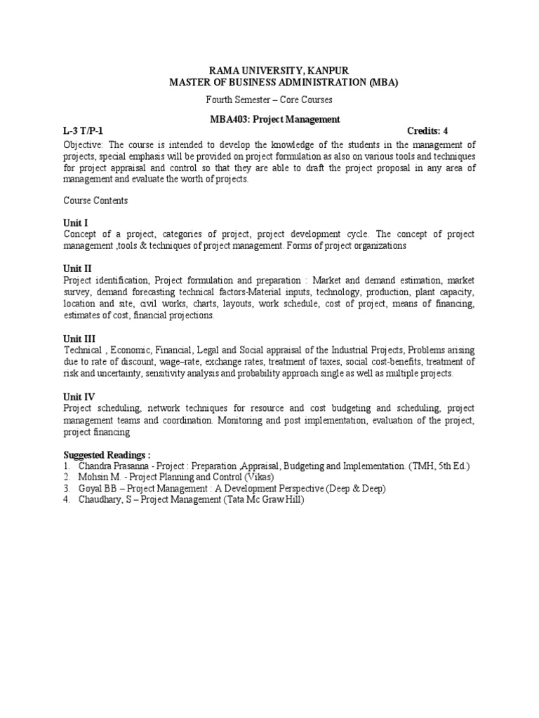 projects, special emphasis will be provided on project formulation as also on various tools and techniques