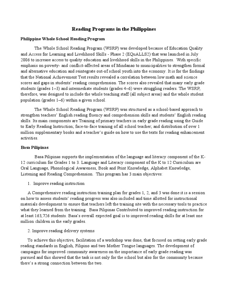 The Whole School Reading Program (WSRP) was developed because of Education Quality