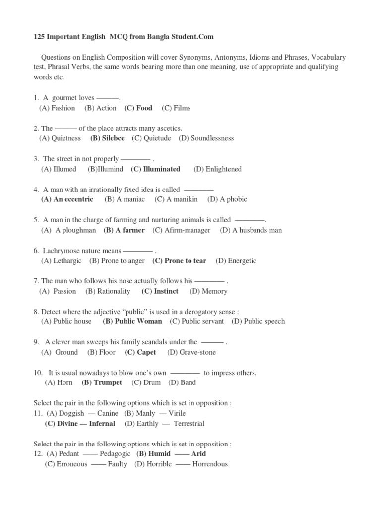 Questions on English Composition will cover Synonyms, Antonyms, Idioms and Phrases, Vocabulary