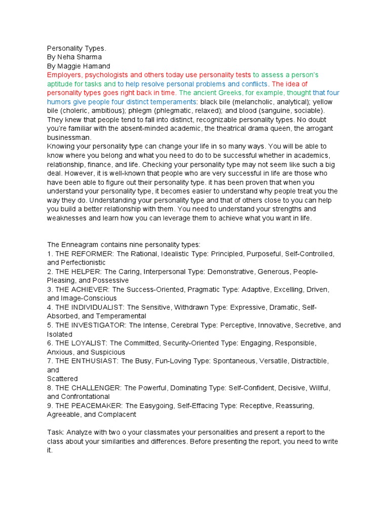 Task: Analyze with two o your classmates your personalities and present a report to the