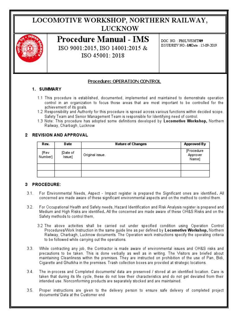 Procedures/Work Instruction in the same guide line as per defined by Locomotive Workshop, Northern