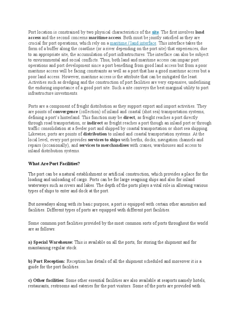 cargo ships. The facilities provided for a port depends on the purpose for which the port is being