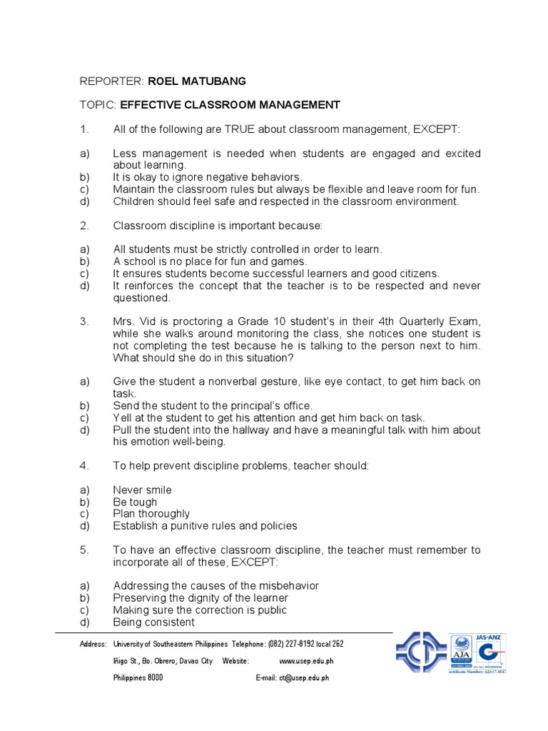 1. All of the following are TRUE about classroom management, EXCEPT: